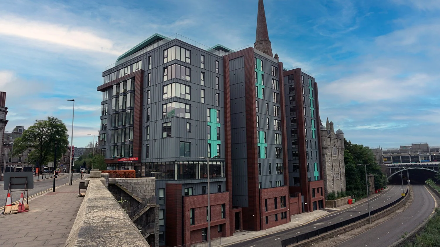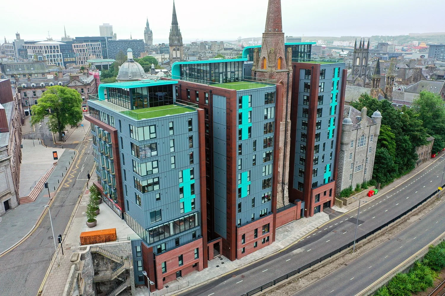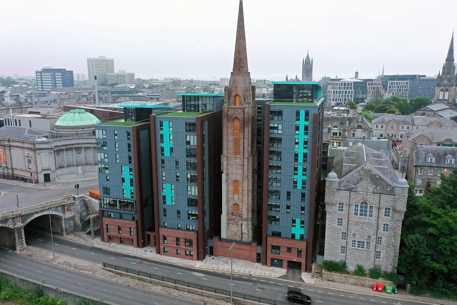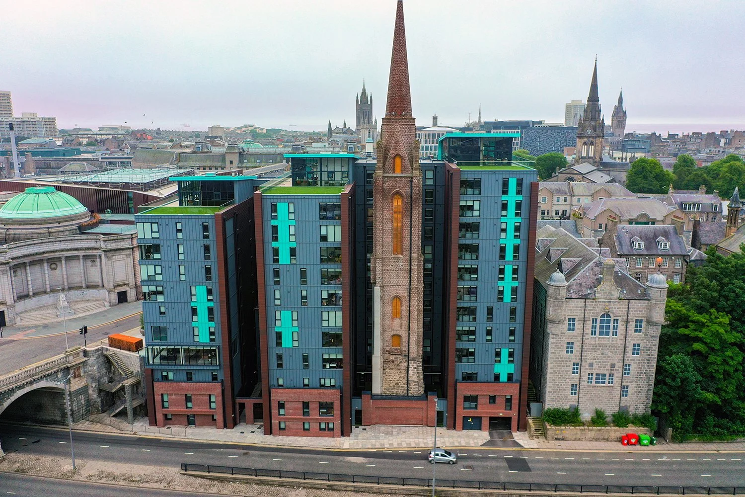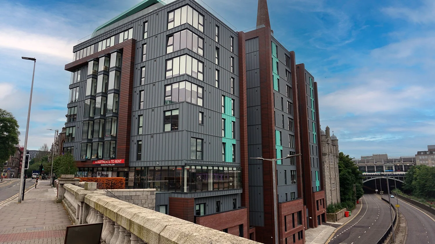 This project is in Aberdeen. 66 new homes for private sale in a mix of 1, 2 and 3-bedroom apartments. Metal Tech installed Zinc Standing Seam, Aluminium Corten effect rainscreen panels, Brick slip and Zinc Standing Seam Roofing and SFS infill to concrete structure.
